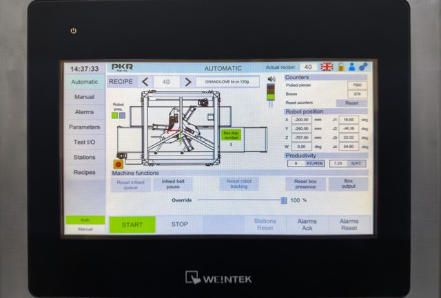 Designed to transfer the knock-down RSC or HSC blanks from the hopper magazine to the erecting station, the machine uses vacuum cups to pull the blanks out of the magazine, fold the two minor flaps into the case, and erect the case within a blink of an eye. Once done, the machine’s dual belt drives drive the erected case through the taping section, where the built-in tape head secures the bottom of the case and discharges the case towards the PKR Delta 1300 cell for loading. Outfitted with reliable SMC pneumatic components and an Omron PLC (programmable logic controller), the BOXXER case erector utilizes venture vacuum technology to ensure highly reliable and repeatable case-erecting at speeds of up to 18 cycles per minute, depending on the model.